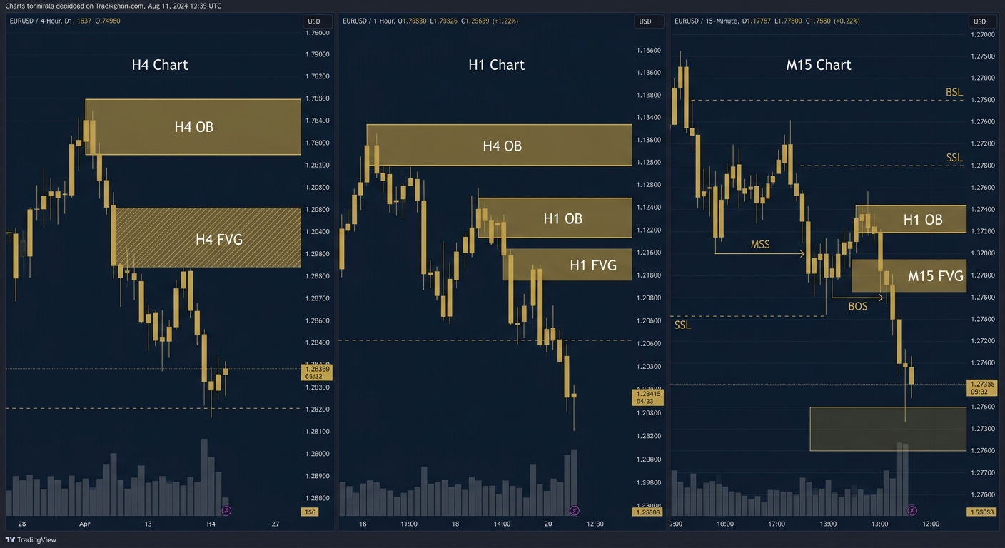 - Confirm with liquidity grab (quick move beyond a key level to trigger stops)